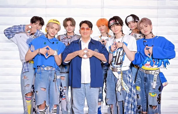 공개된 사진 속 방시혁은 아오엔 멤버들과 함께 그룹 시그니처 포즈를 취하고 있다. 블루 컬러를 포인트로 한 아오엔 멤버들 가운데서 방시혁 역시 같은 컬러의 재킷을 입고 있었고, 환한 미소로 포즈를 취하고 있다.