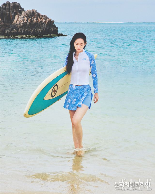 푸른 바다와 웅장한 자연 경관이 교차하는 오키나와 풍광 속, 신현지는 바디 라인을 따라 유연하게 흐르는 실루엣과 미니멀한 디자인의 래시가드를 완벽하게 소화하며, 자연과 유기적으로 어우러지는 독보적인 장면을 연출했다.