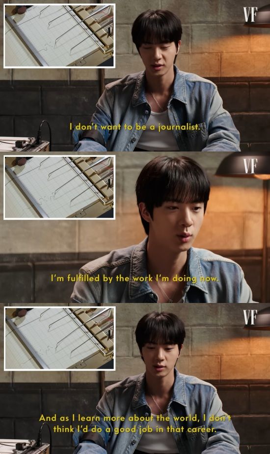 가수로 데뷔하기로 마음먹기 전 기자를 꿈꿨다는 진은 지금도 기자가 되고 싶냐는 물음에 "지금은 기자가 되고 싶지 않다"고 답했다.