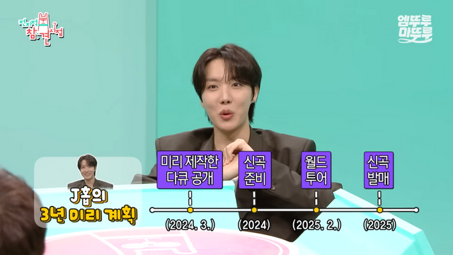 이날 방송에서는 '슈퍼 J' 제이홉이 입대 전 매니저에게 전달했다는 3년 치 계획 중 가장 굵직한 몇 가지를 밝혔습니다. 먼저 ‘2024년 3월, 기다려주는 팬들을 위해 미리 제작한 다큐멘터리 공개’를 꼽았어요. 제이홉이 직접 제안하고 아이디어를 낸 〈HOPE ON THE STREET DOCU SERIES〉는 그의 뜻대로 2024년 3월에 첫 선을 보였습니다. 두 번째 계획은 ‘2024년 하반기, 신곡 준비’와 '2025년 중 신곡 발매'였습니다. MBC 〈나 혼자 산다〉에서도 공개됐듯이, 그는 전역 이후 줄곧 미국과 한국을 오가며 앨범 준비에 매진했죠.