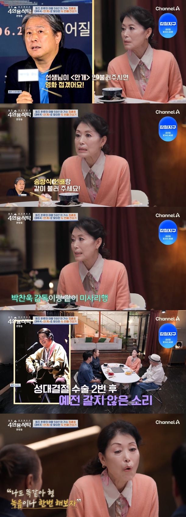 16일 방송된 채널A '4인용식탁'에는 가수 정훈희가 출연했다. 절친으로는 인순이, 박상민, 박구윤이 출연했다.