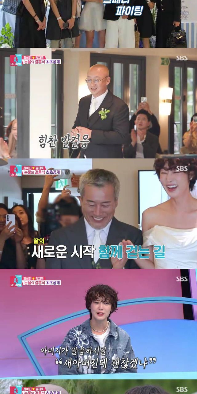 본식이 시작되고 모두의 기대와 달리 신랑 김재욱은 물에서 등장하는 로망은 실현하지 못했지만, 하객들에게 연신 감사 인사를 하며 힘차게 입장했다. 최여진은 아버지의 손을 꼭 잡고 버진 로드를 걸었다. 아버지는 눈시울을 붉혔고, 스튜디오에서 이를 지켜보던 최여진은 “아버지가 ‘새아버진데 괜찮겠냐’고 하시더라. 아니 키워주셨는데 당연히 아빠 손잡고 가야지”라면서 “근데 정말 많이 울컥해 하시더라”고 덧붙였다. 이후 최여진의 아버지는 “초심 변하지 말고 서로 슬플 때나 기쁠 때나 꼭 옆에서 도움이 될 수 있는 부부가 되어 행복하게 남은 인생 잘 살아가길 바랄 뿐”이라며 떨리는 목소리로 축사를 했다. 25년이라는 긴 세월 마음으로 키운 딸을 향한 아버지의 진심은 보는 이들의 마음에도 고스란히 전해지며 감동을 안겼다.