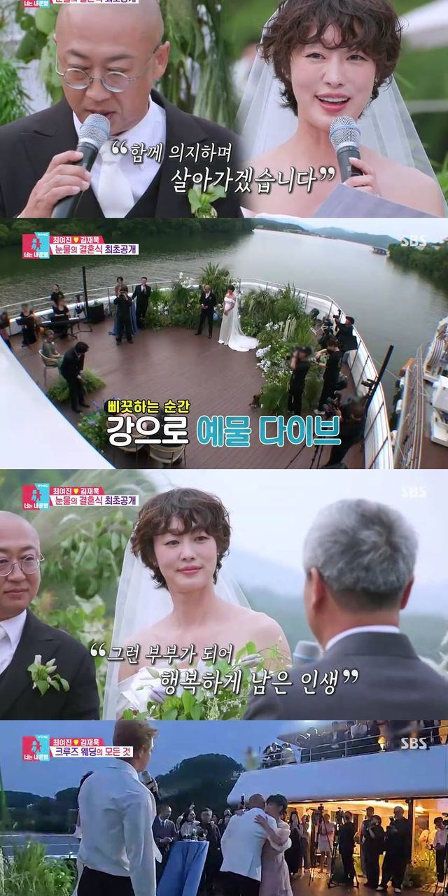 이날 방송에는 결혼 발표 후 연일 화제를 모은 최여진, 김재욱 부부의 낭만적인 크루즈 결혼식이 공개돼 시선을 끌었다. 결혼식을 불과 3일 앞두고 두 사람은 ‘동상이몽’을 보였다. “결혼식을 크루즈에서 하니까 특별한 이벤트가 있으면 좋겠다”는 남편 김재욱은 웨이크 보드 위에서 정장을 착용한 후 물살을 가르며 입장하고 싶다고 했다. 반면 최여진은 “오늘 연습해서 안 되면 끝이다. 성공해도 나는 하고 싶지 않다”고 선을 그었다. 김재욱은 거친 파도에도 능숙하게 보드를 타며 셔츠, 재킷 입기까지 성공해 놀라움을 안겼지만, 결국 연습 도중 발목 부상을 입어 걱정을 자아냈다. 그러나 김재욱은 이에 그치지 않고 골프로 예물을 전달하겠다는 로망을 이루기 위해 연습에 매진하는 모습이 그려지기도 해 웃음을 자아냈다.