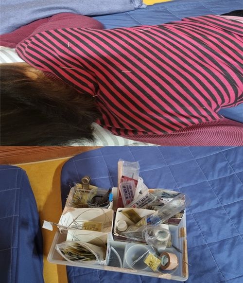 피의자에게 침 시술을 받고 있는 환자(사진 위)와 피의자가 침 시술에 실제 사용한 침과 반창고 등 기타 도구. 제주도자치경찰단 제공