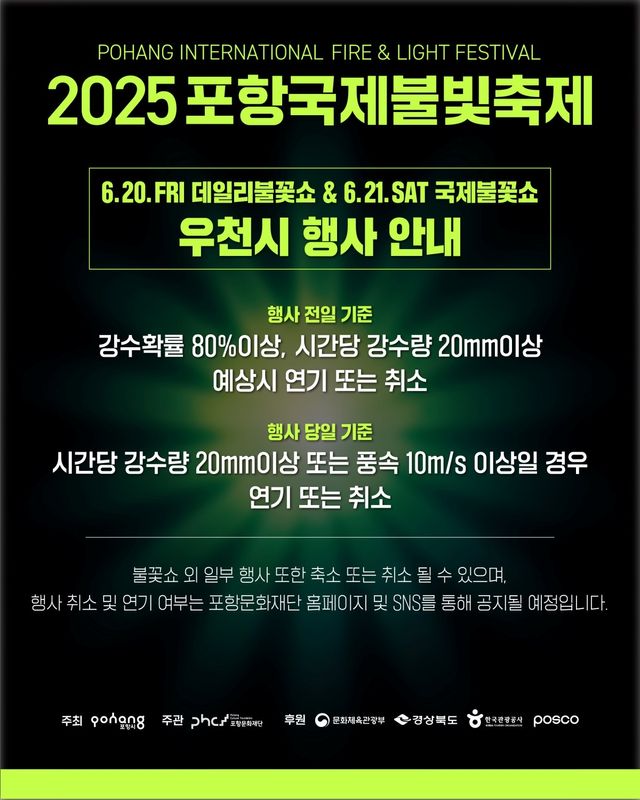 포항문화재단은 “행사 당일 시간당 강수량이 20㎜ 이상이거나 풍속이 초속 10m 이상일 경우에도 행사가 연기 또는 취소된다”고 밝혔다. 강풍이 불 경우 '불빛 드론 쇼'는 진행이 어렵기 때문이다. 재단 관계자는 "기상청 등 기상 조건을 확인할 수 있는 모든 곳을 활용해 불빛 축제가 성공적으로 개최될 수 있도록 점검하고 있다"고 말했다.
