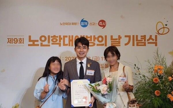 사진 속 최재원은 제9회 노인학대예방의 날 기념식에서 대통령 표창장을 들고 환하게 웃었다.