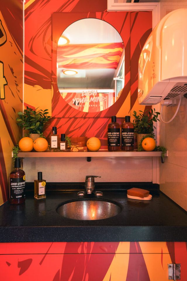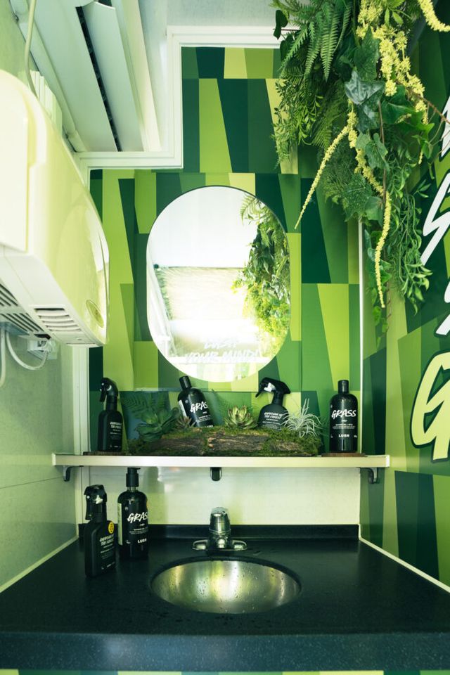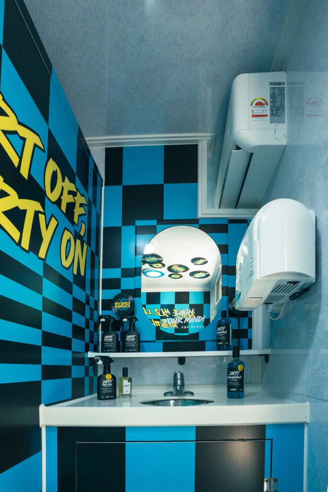 바야흐로 페스티벌의 계절. 음악과 사람이 한데 얽혀 감각을 깨우는 특별한 시간이지만, 필연적으로 불쾌함을 감내해야 하는 순간이 있습니다. 바로 화장실을 이용할 때인데요. 러쉬는 여기에 질문을 던졌습니다. 사실 이 불편함은 ‘어쩔 수 없는’ 게 아닐지도 모른다고요. 그 결과, 러쉬와 함께한 올해 DMZ 피스트레인 뮤직 페스티벌의 화장실은 향기로운 휴식 공간인 ‘프레쉬 워시룸’으로 다시 태어났습니다. 러쉬의 대표 향인 ‘카마(Karma)’, ‘그래스(Grass)’, ‘슬리피(Sleepy)’, ‘더티(Dirty)’를 테마로 각 공간을 꾸미고, 해당 향의 샤워 젤, 보디 스프레이, 퍼퓸 등을 배치했습니다.