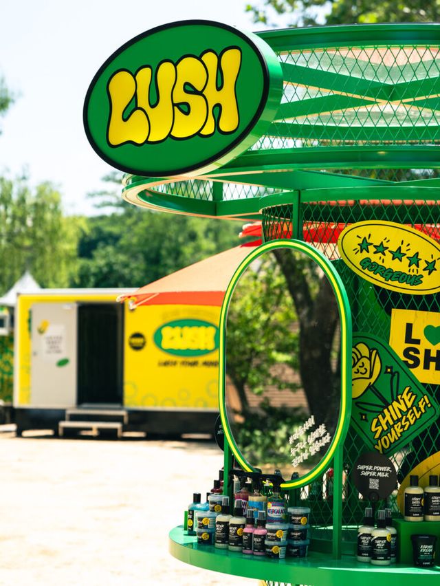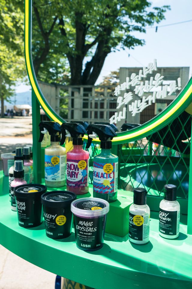 러쉬는 페스티벌 사이트 곳곳에 ‘애프터 샤워 바(After Shower Bar)’도 마련했습니다. 프레쉬 워시룸을 이용한 뒤, 향으로 몸과 마음을 한 번 더 정돈할 수 있는 공간이었는데요. 글리터 미스트, 보디 스프레이, 헤어 세럼 등 다양한 제품을 비치했습니다.