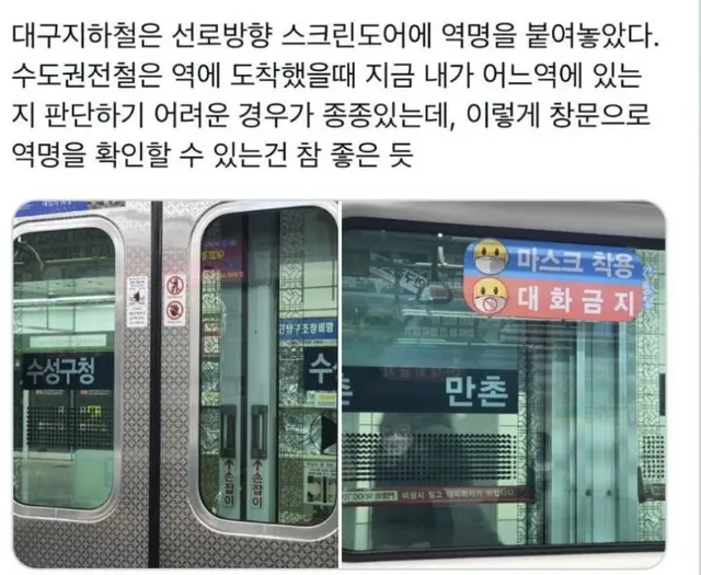 승강장 스크린 도어에 도착역명 붙어있음