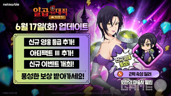 한편, 넷마블은 모바일 캐주얼 RPG '일곱 개의 대죄 키우기'에서도 신규 캐릭터 ‘무한의 마술사 멀린’을 추가하고 신규 등급 ‘초월’을 도입하는 등 콘텐츠 업데이트를 단행했다. 신규 캐릭터는 근력 속성 딜러로, 상대 역할군에 따라 디버프를 부여하는 스킬을 보유하고 있으며, 픽업 소환을 통해 획득할 수 있다.