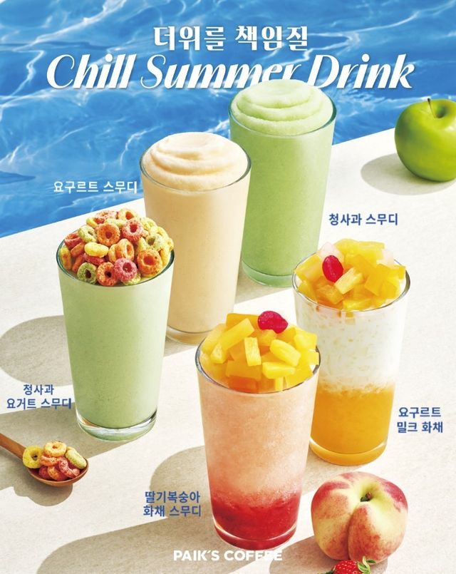 빽다방의 ‘딸기복숭아 화채스무디’는 새콤달콤한 딸기 베이스에 부드러운 복숭아 스무디를 더하고 후르츠 칵테일 토핑을 듬뿍 올린 메뉴다. 복숭아와 딸기의 상큼함이 어우러지며 무더운 여름철 기분 전환에 제격일 뿐 아니라, 풍성히 올린 후르츠 칵테일로 눈과 입을 모두 사로잡는다.