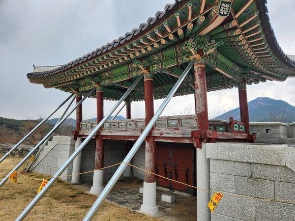 지난해 2024년 12월, 소을비포진성 북문 기둥 일부가 터지고 장귀틀이 부식되어 기울어지는 심각한 손상이 발견돼 현재 출입이 통제된 상태다.