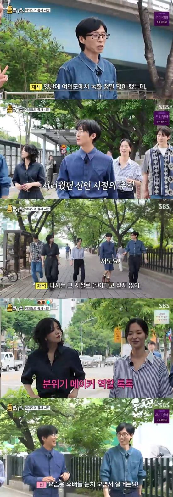 유재석은 여의도를 걸으면서 "예전에 여의도에서 정말 녹화 많이 했는데"라면서 "스튜디오 녹화를 하면 감독님이 그렇게 지적을 많이 했었다. 그 때는 감독님들이 화가 많으셨다. 너무 무서웠다"고 회상했다.