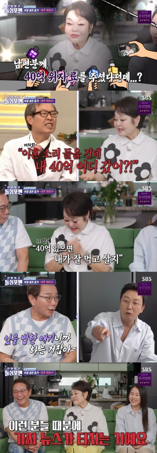 임원희는 이봉원에게 "미선 누나가 40억 주고 이혼하자고 하면 어쩌실거냐"고 궁금해했고, 이봉원은 "40억이야? 확실해? 변호사 있어?"라고 받아쳐 웃음을 줬다.
