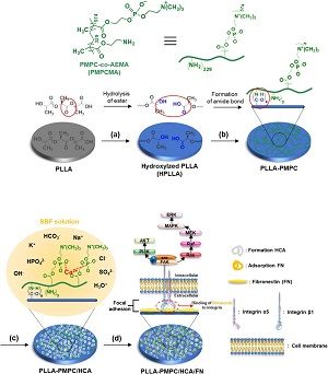 이를 해결하기 위해 교수팀은 PLLA 표면에 인산기(phosphate group)를 도입할 수 있는 생체 친화 코팅물질(PMPC)를 결합하고, 이를 통해 인공 미네랄화(HCA; hydroxycarbonate apatite)를 유도했다.