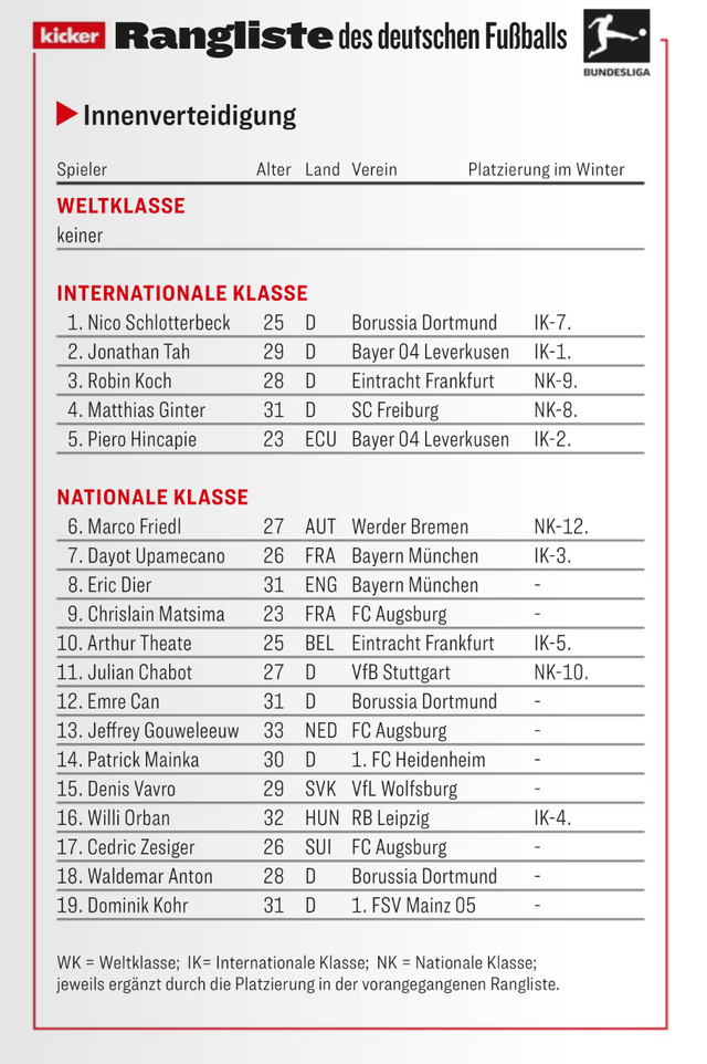 니코 슐로터벡(보루시아 도르트문트)이 전체 1위에 올랐고, 김민재의 영입으로 거취가 불투명해진 요나단 타(바이엘 레버쿠젠)가 2위를 차지했다. 로빈 코흐(아인트라흐트 프랑크푸르트), 마티아스 귄터(프라이부르크), 피에로 잉카피에(바이엘 레버쿠젠)가 그 뒤를 이었다.