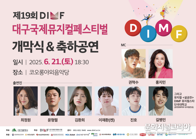 문화저널코리아 조정일 기자 | 뮤지컬 도시 대구가 또 한 번 들썩인다. 국내 유일이자 아시아를 넘어 세계 최대 뮤지컬 축제인 ‘대구국제뮤지컬페스티벌(DIMF)’이 화려한 서막을 여는 ‘제19회 DIMF 개막식 & 축하공연’을 오는 6월 21일(토) 저녁 6시 30분, 코오롱야외음악당에서 개최한다.