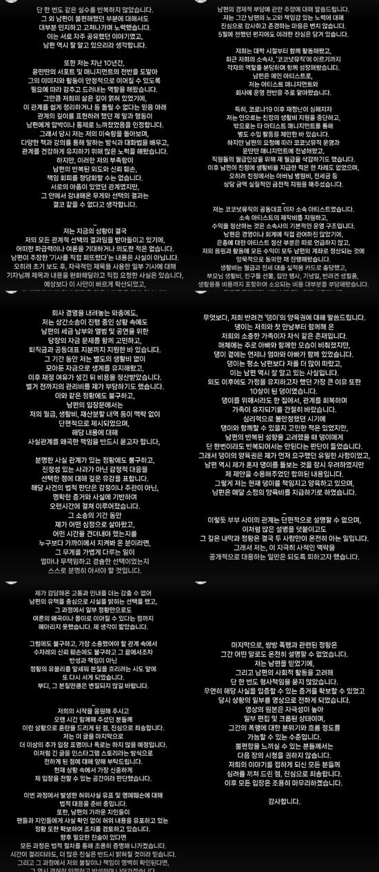 그는 "남편이 주장하는 '선 폭언, 폭행', 그리고 '전적인 경제적 부담'은 사실이 아니며 생활비와 재산분할, 반려견의 양육권에 대한 내용 역시 수많은 정황과 맥락이 생략된 채 전달되고 있다"며 앞서 윤딴딴의 주장을 정면으로 반박했다.