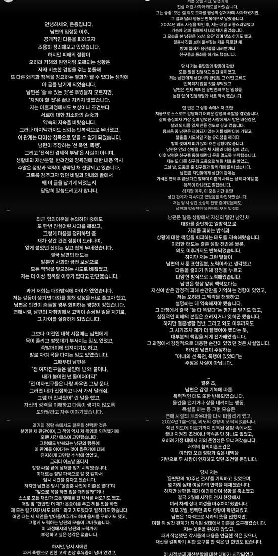 은종은 18일 자신의 계정에 "남편의 입장문 이후 공개적인 다툼을 피하고자 조용히 정리해오고 있었다. 하지만 피해의 정황이 오히려 가해의 원인처럼 오해되는 상황은 저와 비슷한 경험을 겪는 분들께 또 다른 왜곡과 침묵을 강요하는 결과가 될 수 있다는 생각에 이 글을 남기게 됐다"고 전하며 장문의 입장문을 게재했다.