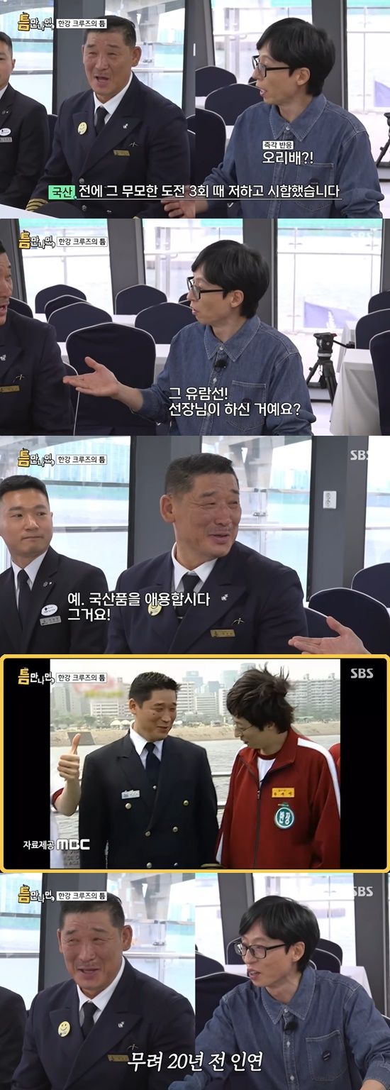 유재석은 "그 유람선, 선장님이 하신 거예요?"라고 물었고, 이 선장은 "네. 국산품을 애용합시다 그거요"라고 말하며 웃었다. 유재석도 "그 때 이국산 선장님이시네"라면서 반가움의 악수를 진행했다.