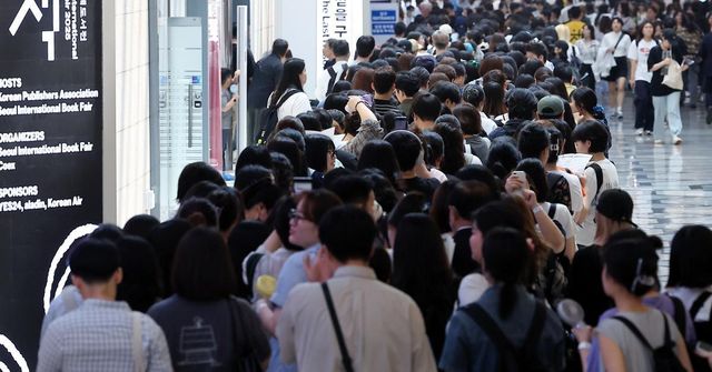 18일 오전 서울 강남구 삼성동 코엑스에서 열린 2025 서울국제도서전을 찾은 관람객들이 일찍부터 줄을 서 입장을 기다리고 있다. / 뉴스1
