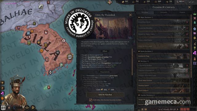 해당 소식은 지난 17일, 크루세이더 킹즈 3 스팀 공지를 통해 전해졌다. 공지글에서는 일본, 한국 등 동아시아 지역 개발 현황이 담겼다. 한국의 경우 9세기에서 15세기 사이를 다루는 게임 특성상, 후삼국 시대와 고려를 중점적으로 그린다. 경주, 진주, 나주 등 실제 지명은 물론, 국왕 왕휘, 안찰사 문장필 등 고려 느낌을 살린 가상 캐릭터와 직급 등도 확인할 수 있다.