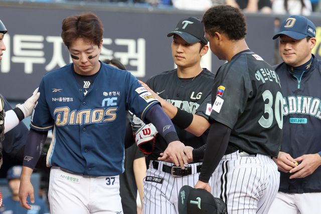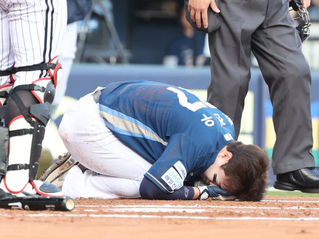 충격 탓에 한동안 일어서지 못한 박건우는 1루까지 걸어간 뒤 대주자 한석현으로 교체됐다.