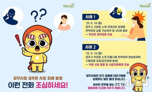 한편 양주시는 유사 사기 피해를 방지하기 위해 지역 내 사업자와 시민을 대상으로 한 주의 안내 및 홍보를 강화할 방침이다.