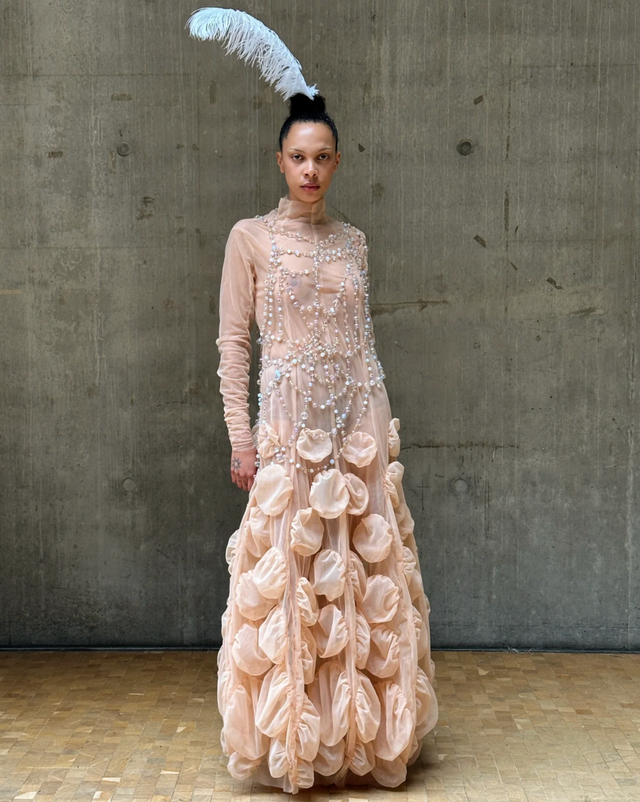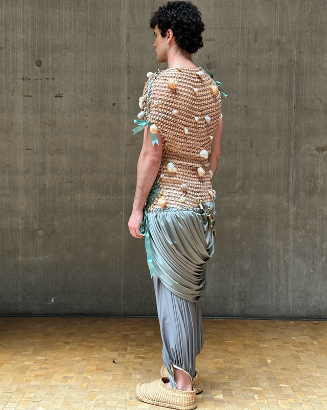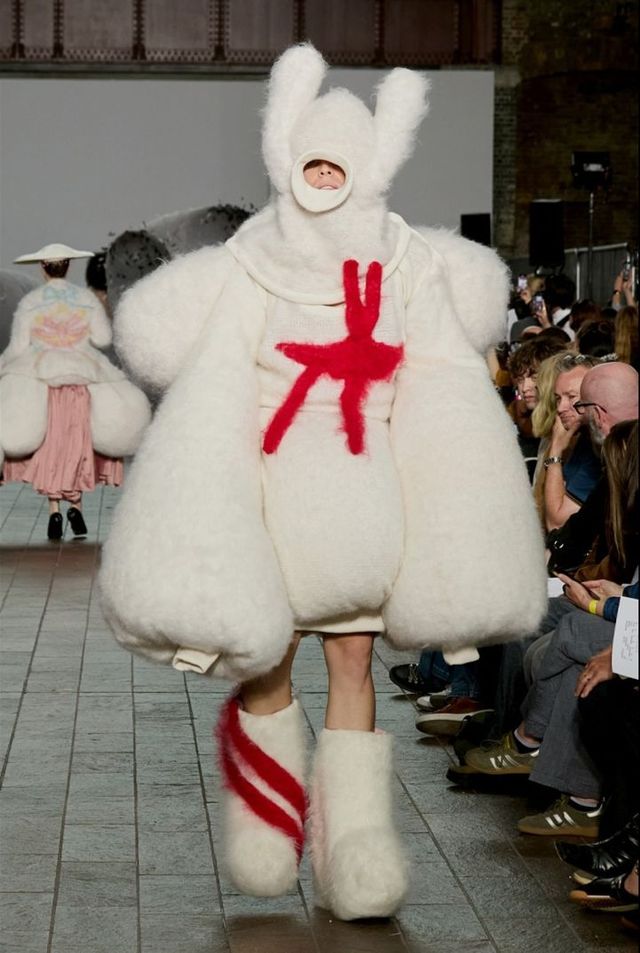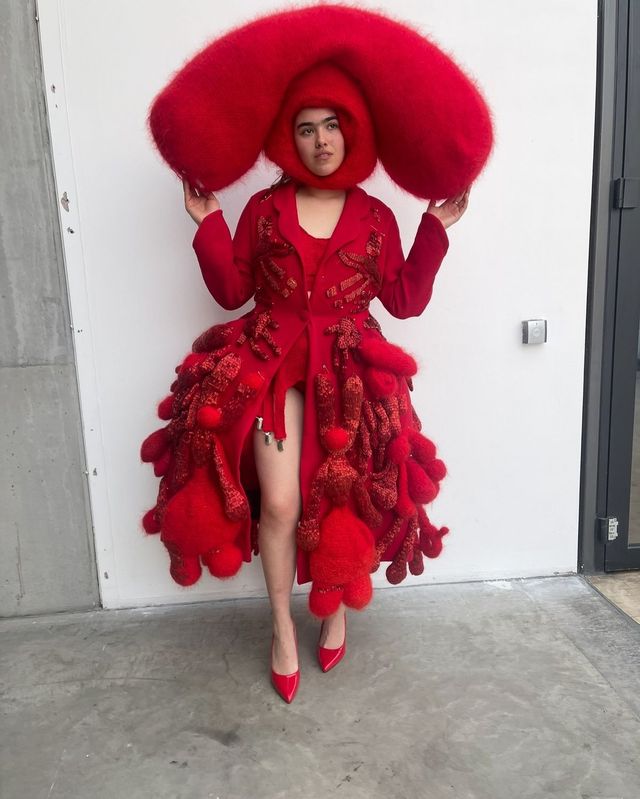 2025 세인트 마틴 졸업 쇼의 1등을 거머쥔 주인공부터 살펴보죠. 마야의 컬렉션은 1950년대 텍사스에 UFO가 추락했다는 이야기에서 출발합니다. 주제가 흥미로운 만큼 매우 독창적인 작품이 탄생했죠. 구미호를 떠오르게 하는 라텍스 꼬리, 부풀어 오른 형태로 신체를 감싸는 크로셰 니트까지. 독특한 형태와 소재로 이야기 속 마을 사람들을 유쾌하게 그려냈습니다. 자칫 과해 보일 수 있는 옷도 마야의 손을 거치면 익살스러운 매력이 살아나죠. 그의 옷을 입은 아티스트들의 모습이 벌써 기대되지 않나요?