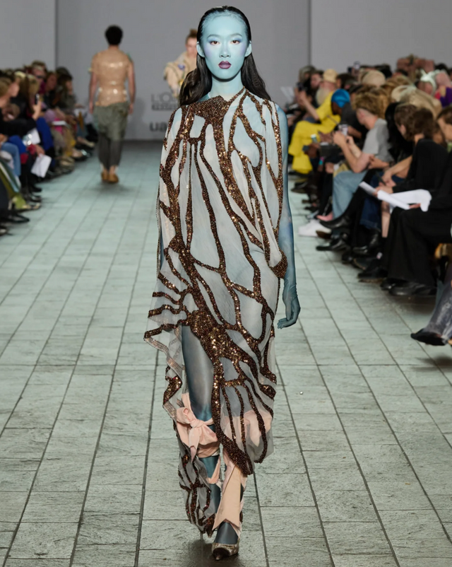 풀이 무성한 정원에서 막 깨어난 듯한 요정 같은 모델이 등장합니다. 벨기에 외곽 숲에서 영감을 받은 안토니오는 ‘자연’이라는 고전적인 주제를 감각적으로 풀어냈습니다. 거미줄처럼 얽힌 실루엣과 촉수 같은 곡선이 몸을 휘감습니다. 살아 있는 듯 거친 질감은 완벽하지 않아서 더 아름다운 자연을 닮았죠. 안토니오는 어디서 어떻게 피어날지 모르는 자연처럼 예측할 수 없는 패션의 가능성을 보여줬습니다.