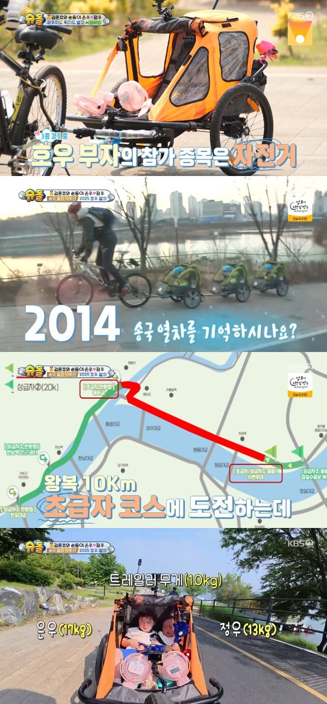 3종 경기 중 김준호 부자의 참가 종목은 자전거라고. 지난 2014년, 송일국이 자전거에 유모차 세 개를 연결해 삼둥이를 태운 '송국열차'가 전파를 타며 화제가 되었던 바.