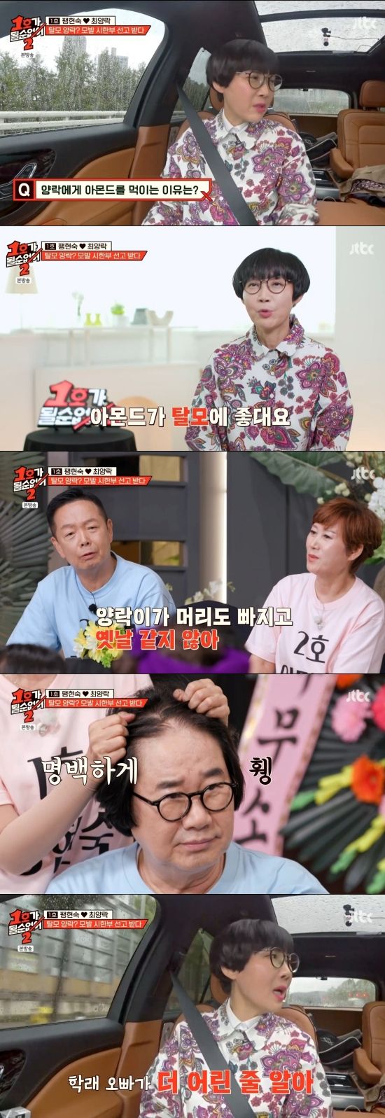 "여기가 없다"면서 최양락의 휑한 이마를 공개했다. 결국 팽현숙은 "더 이상 진행되지 않는 게 중요하다. 당장 머리를 심을 것도 아니고, (탈모가) 진행되지 말라는 뜻에서 관리하고 있다"고 덧붙이며 '양락 탈모 방지 프로젝트'를 설명했다.
