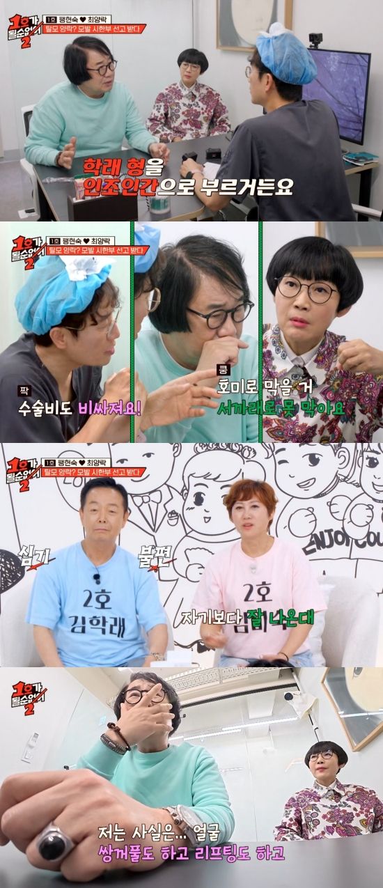 이어 최양락은 "저는 사실 얼굴에 쌍꺼풀 수술도 하고 리프팅도 했다. 그런데 머리까지 하면 내가 학래 형이랑 다를 게 뭐냐. 내가 학래 형을 인조인간으로 부른다"고 뜻밖의 이유를 밝혔다.