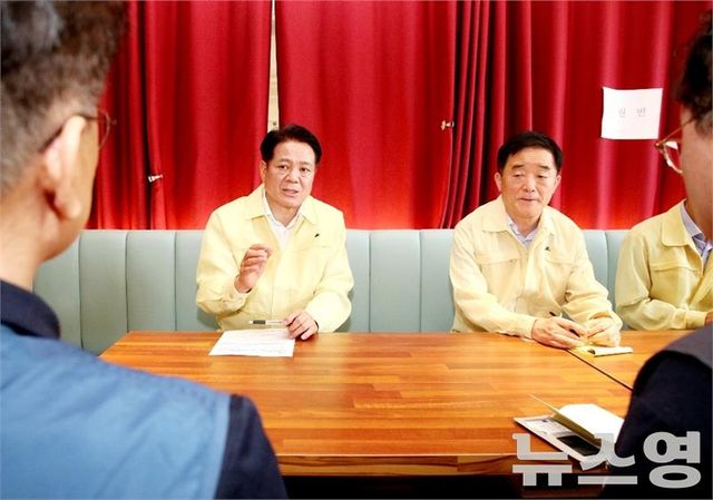 최대호 안양시장(왼쪽)과 강득구 국회의원(오른쪽)이 신안산선 붕괴사고 관련해 시행사와 시공사 관계자들을 만나 이야기하고 있다./사진=안양시