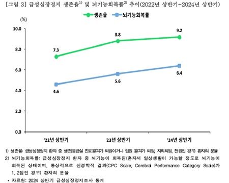 2024년 상반기 급성심장정지 환자 생존율은 9.2%를 기록했으며, 이는 2023년 상반기 8.8% 대비 0.4%p 증가한 수치다.