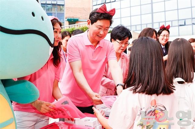 참석자들은 분홍색 티셔츠를 입고 피켓과 함께 분홍색 파일‧키링‧지우개, 휴대용 선풍기 등 홍보 물품을 학생들에게 나눠주며 학교폭력과 따돌림 방지 캠페인을 벌였다.