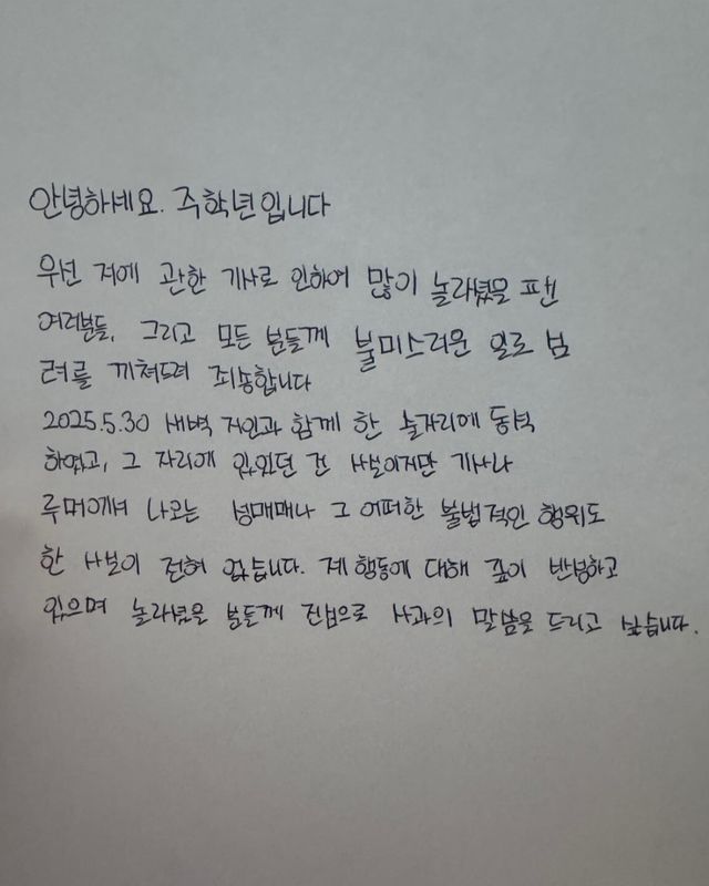 (엑스포츠뉴스 김수아 기자) 사생활 논란으로 소속 그룹을 탈퇴한 주학년이 뒤늦게 자필 사과문을 게재했다.