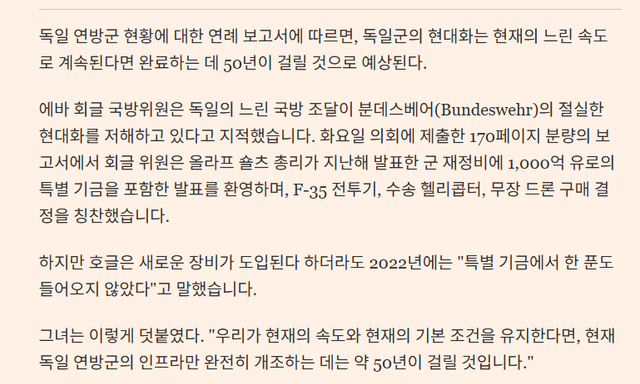 2023년 독일 국방부 장관은 직설적으로 "이대로가면 독일군 현대화는 반세기는 걸린다"고 발언함