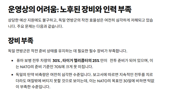 레오파르트 전차와 PzH2000 자주포 등으로 '정예 강군'으로 평가받던 독일 연방군은 이제 이미지만 남았고 실질 전투력에 대해서는 물음표를 띄우는 형국임.