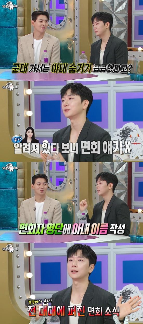 고우림은 "아무래도 아내가 워낙 얼굴이 알려져 있다 보니 면회를 자주 부르지 않았다. '너무 가고 싶다'고 해서 왔다"고 말문을 열었다. 이어 "처음 면회 명단에 와이프 이름을 썼는데 전 대대에 소문이 났다. 와이프가 면회 오는데 불편한 상황이 생길까 봐 걱정됐다"고 당시를 회상했다.