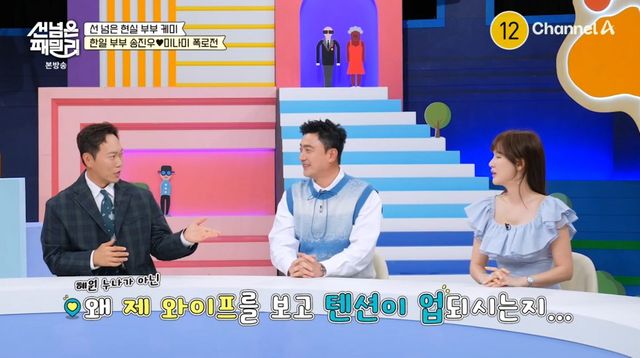 그러자 송진우는 안정환에게 “아니 근데 본인 아내 옆에서는 다운되는 데 왜 남의 아내 옆에선 텐션이 업 되냐”며 견제에 나섰다.