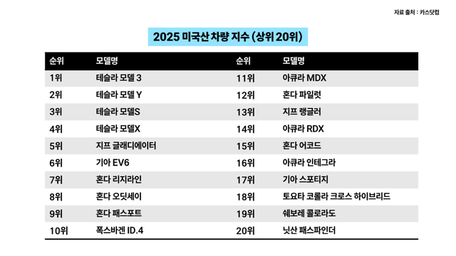 이러한 흐름 속에서 자동차 정보 플랫폼 ‘카스닷컴’이 발표한 ‘2025 미국산 차량 지수’가 눈길을 끌고 있다. 해당 지수는 차량의 조립 위치, 부품·엔진·변속기 조달처, 미국 내 생산 비중과 고용 효과 등을 종합적으로 반영한 순위다. 완벽한 기준은 아니지만, 미국 내 제조업 기여도를 가늠할 수 있는 하나의 지표로 받아들여지고 있다.
