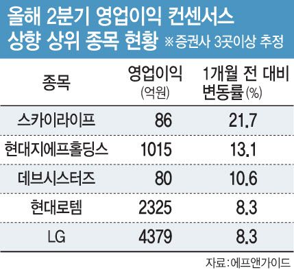 이외에 현대로템(064350)과 LG(003550)는 각각 올해 2분기 영업이익 추정치가 각각 8.3% 개선된 것으로 나타났다. 현대로템은 K2 전차 수출 물량 확대가, LG는 연결 자회사인 LG씨엔에스(064400)의 인공지능(AI) 및 클라우드 사업을 통한 수익성 개선이 양호한 실적 모멘텀으로 작용할 것이란 분석이 나온다.