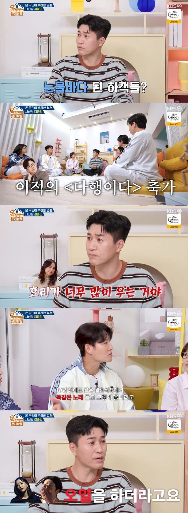 하객들의 눈물 포인트는 이적의 '다행이다' 축가 때였다고. 이어 김종민은 "효리가 너무 많이 울더라 갑자기"라며 하객으로 참석한 이효리의 눈물에 놀랐던 마음을 전했다.