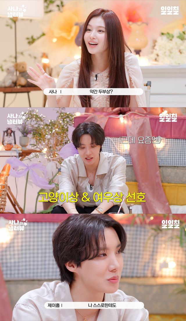 이어 사나가 이상형을 묻자, 제이홉은 “이런 질문 10년 만에 받아본다”고 당황스러워했다. 사나는 “오빠라서 묻는 거 아니다. 냉터뷰의 시그니처 질문”이라고 설명했다.