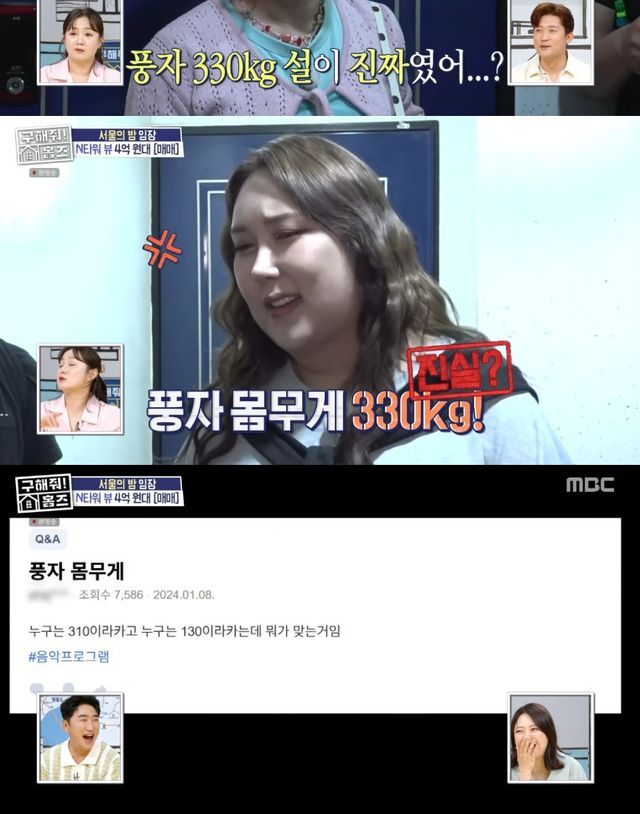 이에 박나래는 "그럼 그게 진짜야?"라며 놀란 표정을 지었고, 이어 "얘가 300kg설이 있었다"며 실제로 인터넷에 한 네티즌이 풍자의 몸무게가 300kg이 넘는지를 물은 것을 봤음을 전했다.