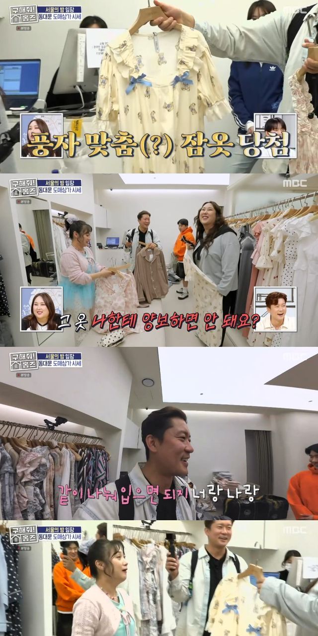 생각보다 괜찮은 수량에 박나래는 '동대문 임장 기념 잠옷 임장'을 제안했고, 그렇게 김대호가 박나래와 풍자의 잠옷을, 두 사람이 김대호의 잠옷을 고르는 방식으로 쇼핑이 시작됐다.