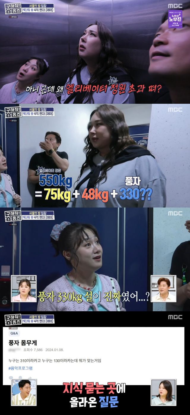 한편, 이날 방송에서는 풍자의 330kg 의혹이 제기되기도. 엘리베이터로 임장지에 올라가던 풍자는 'FULL'이라는 정원 초과 표시에 당황해했다.