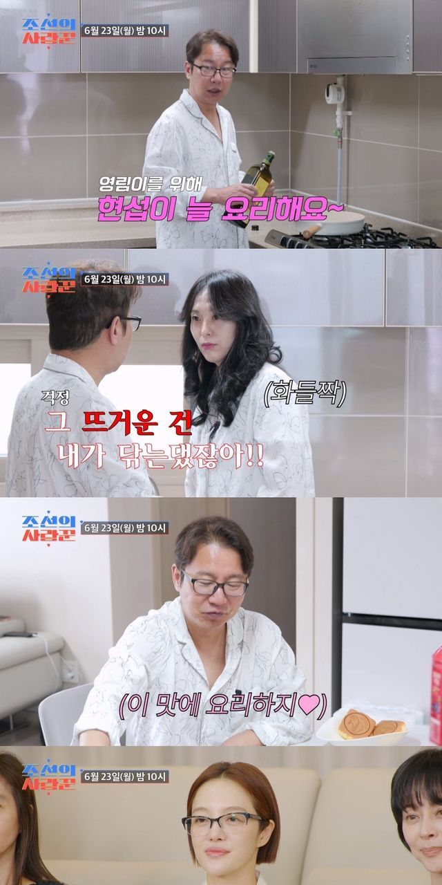 23일 오후 방송될 ‘조선의 사랑꾼’에서는 심현섭♥정영림이 결혼 후 둥지를 튼 울산 신혼집으로 제작진이 찾아간다. 커플 잠옷 차림으로 제작진을 반갑게 맞이한 심현섭은 아침 식사를 준비하고 있었다. 그는 “(영림을 위해) 늘 내가 세끼를 차린다. 별거 없다”며 영림이 좋아하는 오믈렛과 샐러드를 준비했다. 심현섭이 그릇 세팅을 위해 잠시 불 앞을 비운 사이, 영림이 아직 식지 않은 프라이팬 정리를 시도했다. 이에 심현섭은 “그 뜨거운 건 내가 닦는다고 했잖아! 뜨거운 건 남자가 닦는 거라고…저번에 데어서 울었잖아”라고 별안간 영림에게 애정 어린 큰소리를 내지르며, 믿음직한 남편의 면모를 보였다. 둘의 꿀이 뚝뚝 떨어지는 애정 행각에 VCR 너머의 사랑꾼 MC들은 아우성(?)을 보내 웃음을 자아냈다.
