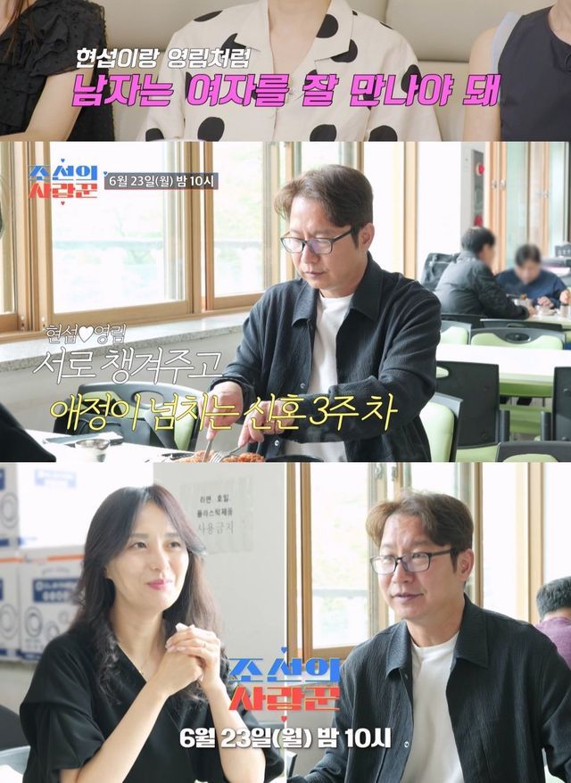 심현섭♥정영림의 신혼 3주 차 알콩달콩 깨가 쏟아지는 일상은 극사실주의 다큐 예능 TV CHOSUN ‘조선의 사랑꾼’에서 6월 23일(월) 오후 10시 공개된다.